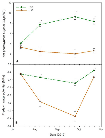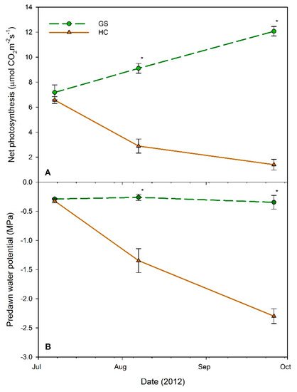 No differences in Ψpd between GS and HC were detected at the first measurement date in July (p = 1.000), but HC plots exhibited significantly lower values than GS for the remaining three measurement points (August, September, and October 2012; p < 0.0301), during and after the drought period. GS decreased 0.24 MPa (96%) from July to September, while HC decreased 1.10 MPa (440%). The September Ψpd values were most negative for both vegetative competition levels, respectively, but they both recovered to near July values by 21 October (Figure 3B), after 4.6 mm of precipitation fell between 13–21 October (Figure 2).