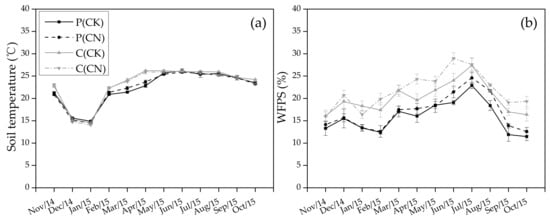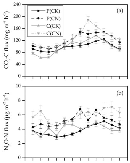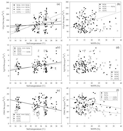 Soil CO2 emission rates were positively correlated with soil temperature and soil moisture (Figure 3a,b), but the correlation between CO2 flux and soil moisture was significant in P(CN) only (Table 2). The N2O emission was significantly and positively correlated with soil temperature in both P(CK) and C(CK) (Figure 3c). However, no significant correlation was found between soil N2O flux and soil moisture (Figure 3d and Table 2).