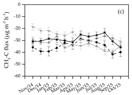 The soil CH4 flux in the study plantations varied from −22.4 to −34.9, which indicates that the soils are sinks for atmospheric CH4. This is consistent with previous studies [5,41]. According to the present study, the tree species affects the CH4 uptake rate (Table 3). The soil CH4 uptake rate can be higher in broad-leaved forests than in coniferous forests [17,18,20]. However, so far little is known about the soil CH4 flux in coniferous and broad-leaved mixed forests, particularly in near natural plantations. In this study, the soil CH4 uptake rate was lower in the near natural plantations than in the control forests (Table 3). This indicates that near natural management reduces the soil CH4 uptake rate in P. massoniana and C. lanceolata plantations.