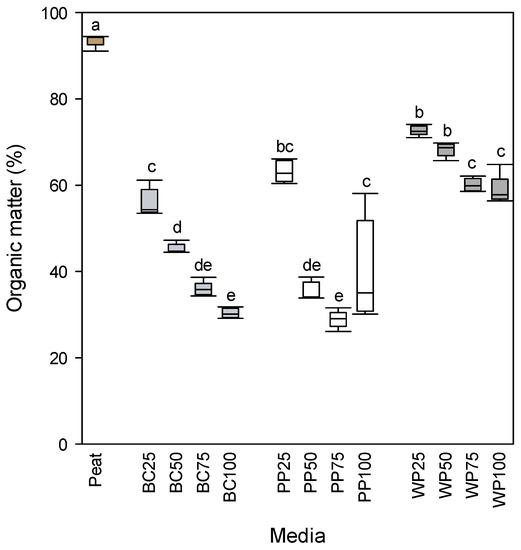 Organic matter (n = 5) for peat and peat amended with biochar powder (BC), pyrolyzed softwood pellets (PP), and composite wood−biochar pellets (WP) at rates of 25, 50, 75, and 100% (v v−1). Vertical boxes represent approximately 50% of the observations and lines extending from each box are the upper and lower 25% of the distribution. The solid horizontal line in the center of each box is the median value. Different letters indicate significant differences at α = 0.05.