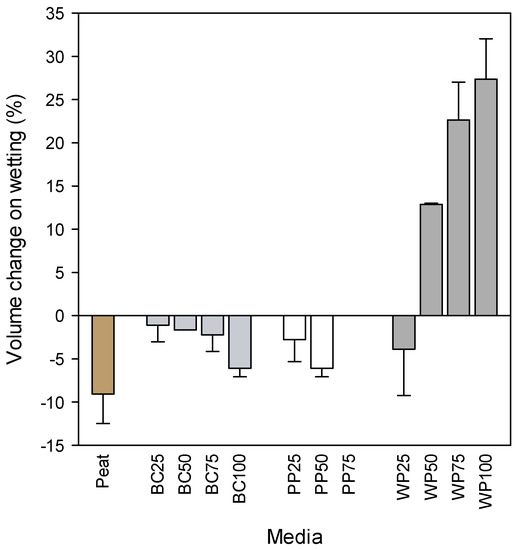 When initially exposed to water, all growing media absorbed water with the exception of BC100 (data not shown). During the first 5 min, BC25 and BC50 absorbed only about one-fourth and one-fifth that of peat, respectively. Conversely, absorption doubled or tripled for PP ≤75 compared to peat and absorption values for WP25 and WP50 were similar to peat. Upon initial wetting of the media to container capacity, only WP50, WP75, and WP100 showed an increase in volume (≈12 to 27%) (Figure 2). Conversely, the shrinkage in peat was about 9%. The addition of BC ≤75% and any addition of PP (except PP50) decreased the shrinkage relative to 100% peat.