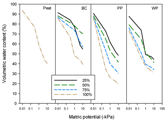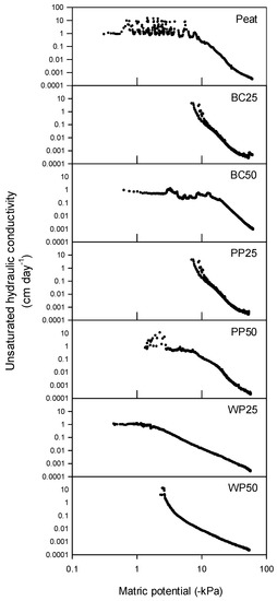 For peat, the water conductivity occurred at the highest matric potential (−0.3 kPa) but the rate was variable (1 to 10 cm day−1), declining steadily once the matric potential dropped to −10 kPa (Figure 3). BC50 and WP25 also showed consistent conductivity of about 1 cm day−1 at the highest potential. While BC50 followed a similar trend to peat, conductivity in WP25 began a steady decline at about −10 kPa. Water moved about 1 cm day−1 in PP50 at matric potentials between −1 and −10 kPa. BC25 and PP25 had little conductivity at matric potentials <−7 kPa, whereas WP50 had little conductivity at matric potentials <−5 kPa.