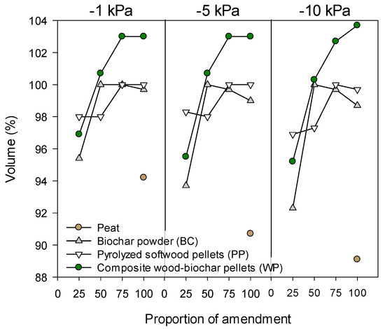 Media sample volumes at three matric potentials in relation to the initial wet volumes (=100%) (n = 5) for peat amended with biochar powder (BC), pyrolyzed softwood pellets (PP), and composite wood−biochar pellets (WP) at rates of 0, 25, 50, 75, and 100% (v v−1).