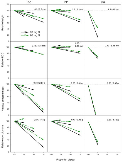 Vectors representing the changes in relative morphological values (height; root-collar diameter, RCD; and root and shoot biomass) for seedlings grown in peat (endpoint) and peat amended with biochar powder (BC), pyrolyzed softwood pellets (PP), and composite wood−biochar pellets (WP) at rates of 25, 50, and 75% (v v−1; arrows) and supplied with either 20 (solid black line) or 80 (dashed green line) mg N. The control means for each N rate (low/high) are provided.