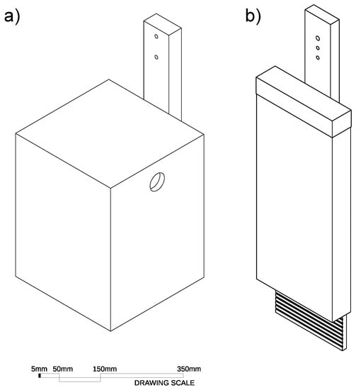 Diagrams of the two nest box designs: (a) glider boxes constructed with 12 mm marine plywood: 27 × 28 × 36 cm (width × depth × height); circular entrance diameter, 3.5 cm; internal volume, 20,845 cm3; (b) bat boxes constructed with 12 mm marine plywood with a narrow, single-chamber, open-bottomed design: 43 × 7.5 × 50 cm (width × depth × height); bottom entrance width, 1.5 cm; internal volume, 9555 cm3.
