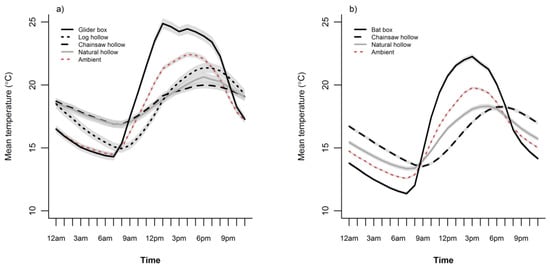 Mean temperature (°C, calculated from raw data) over 24 h inside natural and artificial hollows compared to external ambient conditions. (a) temperatures were recorded hourly in glider boxes, log hollows, natural hollows, chainsaw hollows, and outside under shaded ambient conditions over 50 days in spring (2 October to 20 November 2016) and 60 days in summer (23 December 2016 to 20 February 2017); (b) hourly temperatures were recorded in bat boxes, natural hollows, chainsaw hollows, and outside under shaded ambient conditions over 63 days in autumn (5 March to 6 May 2015). Shaded areas represent 95% confidence intervals.