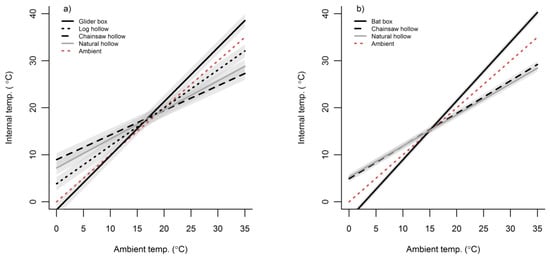 Modelled data showing predicted mean internal cavity temperatures (°C) across all ambient temperatures experienced during the study. (a) temperatures were recorded hourly in glider boxes, log hollows, natural hollows, chainsaw hollows, and outside under shaded ambient conditions over 50 days in spring (2 October to 20 November 2016) and 60 days in summer (23 December 2016 to 20 February 2017); (b) temperatures were recorded hourly in bat boxes, natural hollows, chainsaw hollows, and outside under shaded ambient conditions over 63 days in autumn (5 March to 6 May 2015). Shaded areas represent 95% confidence intervals. See Appendix C for Table of modelled parameter estimates.