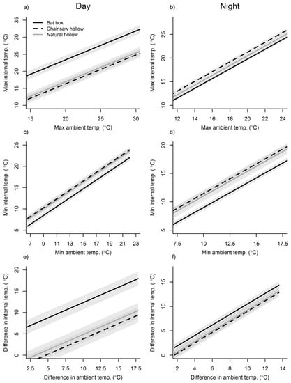Modelled data showing predicted temperature (°C) response variables in bat nest boxes, chainsaw hollows and natural hollows across the range of ambient temperatures recorded during the autumn survey period (5 March to 6 May 2015). Panels on the left show modelled averages recorded during the day ((a), daytime maximum; (c), daytime minimum; (e), difference between daytime maximum and minimum), and panels on the right for night ((b), nighttime maximum; (d), nighttime minimum; (f), difference between nighttime maximum and minimum). Shaded areas represent 95% confidence intervals. See Appendix D for Table of modelled parameter estimates.