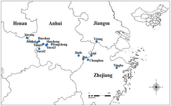 Fresh leaves of P. subaequalis were collected from all 14 known extant populations (Table 1) located across this historic range in eastern China (Figure 1) in July 2016. Five leaves per tree and 10 mature trees per population were selected, and from the four geographical sides of the crown, four outermost branches were randomly harvested. The distance between individual trees was approximately 50 m, which was far enough apart to minimize the possibility of sampling related individual effects [27,28]. Voucher specimens were deposited at Nanjing Forest University (NJFU). Long-term climate data collected over 29 years (1981–2010), including MAT (°C) and MAP (mm), were obtained for each sampling site from the China Meteorological Data Sharing Service System (CMDSSS; www. cdc.cma.gov.cn [29], Table 1).