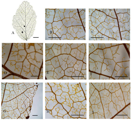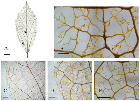 Observations of the leaf venation pattern were carried out according to Zhao et al. (2016) [18], with 15 leaf venation characteristics (Table 2) selected for analysis. Fresh or herbarium leaves were cleared according to Dizeo de Strittmatter (1973) [30] and stained in safranin/80% ethanol. The samples were mounted in DPX (Aldrich Chemical Company, Gillingham, UK) and viewed with the Zeiss Stereo Microscopea Zeiss Axiolab microscope (Carl Zeiss, Oberkochen, Germany), photographed using a color digital imaging camera.