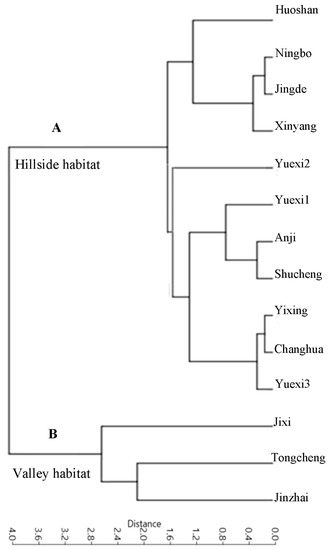 Unweighted pair-group method with the arithmetic means (UPGMA) analysis using variables of 15 leaf venation characteristics of P. subaequalis. (A) Hillside habitat type; (B)Valley habitat type.