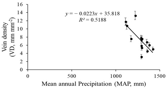 Regression analysis between P. subaequalis of vein density (VD) and the climatic factors of mean annual precipitation (MAP) in 14 sampling sites across eastern China. Each dot represents a sampling site in China. (p = 0.001).