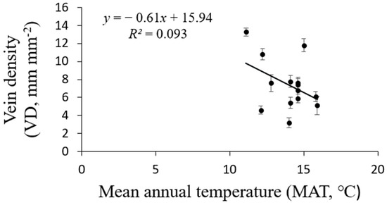 Regression analysis between P. subaequalis of vein density (VD) and the climatic factors of mean annual temperature (MAT) in 14 sampling sites across eastern China. Each dot represents a sampling site in China. (p = 0.145).
