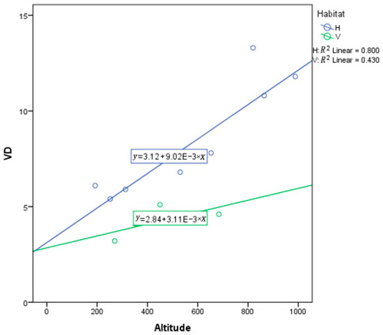 Regression analysis of the VD (mean ± SD) with elevation. The VD is significantly related to the elevation (p = 0.0007). Each dot represents a sampling site in China.