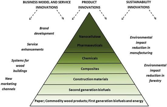 In our study, we approach innovations in forest bioeconomy from the viewpoint of a value-added pyramid (Figure 1) and by recognizing innovation opportunities in terms of products, production processes, services, or business models. The bottom segment of the pyramid consists of incremental improvements in traditional pulp, paper, and wood products and wood-based bioenergy. The middle section is characterized by more value-added components, which could be advanced biofuels, biomaterials, and composites, or from an organizational innovations point of view, developing new marketing channels, service enhancements, or the reduction of environmental impacts. The top of the pyramid then includes higher-value added, niche products such as highly sophisticated system solutions (for example in the new tall wooden buildings), fine chemicals, or nanocellulose. Nanocellulose is, due to its high versatility, perhaps the most interesting new niche material discussed under the umbrella of forest bioeconomy [33]. Nanocellulose has the most promising applications in light-weight fibre-based packages and composites with excellent strength properties and potentially some added functionality, the modification of rheological properties of liquids and suspensions in various industrial fields, transparent films as barrier materials, substrates for printed electronics and electronic displays, hydrogels for medical applications, and aerogels for filtration and insulation [34].