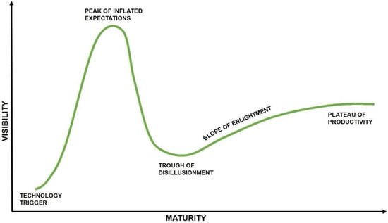 Technology hype cycle models have mainly been developed and utilized for the purpose of the early identification of new and convergent technologies and of forecasting potential social change (e.g., [27]). In particular, supported by the development of bibliometric methods, attempts to analyse hype cycles through quantitative analytical approaches and to utilize their results in forecasting (e.g., [36,37]) have been developed. Among technology cycle models, Gartner’s hype cycle model [38] (see Figure 2) has become popular due to its explanatory power.