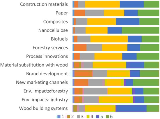 Respondent distribution to the statement: “Since the year 2000, forest sector companies have produced significant innovations related to…” (Scale from 1 = Strongly disagree, to 5 = Strongly agree, 6 = I don’t know).