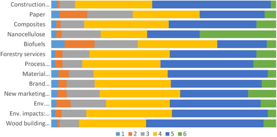 With reference to our two research questions, we conclude that the image of past forest sector innovativeness among the respondents from the four European forest rich countries is not necessarily a product-related issue. Instead, it is more based upon the respondents’ awareness of the innovations, since, for instance, very few respondents had any view of the category that is seen as the most promising among industry itself, i.e., nanocellulose [34]. It was also perceived that in the next 15 years, the forest sector should continue to focus on wood construction and building system-related innovation efforts, likely linked to international policy targets related to climate change mitigation and carbon capture. This is also in line with previous research from Finland and Sweden, which states that wooden multi-story construction is considered to have the most promising new business opportunity for the future bioeconomy [23].