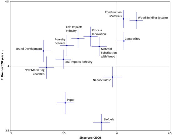 Applying the same data to a performance importance grid (see Figure 5) using the variables of the past developments (i.e., the statement formulated as, “Since year 2000, forest sector companies have produced significant innovations related to…”) as performance indicators, and the variables on future requirements (i.e., the statement formulated as, “For societal and sustainable development, I think the forest sector should focus in their innovation efforts over the next 20 years on…”) as importance indicators, additional information can be extracted. According to Figure 5, construction materials, wood building systems, and composites can be all found in the top right quadrant of the grid. Those innovation areas can be therefore considered as top performers, and they are considered as important, as well as already successful, in terms of awareness among the respondents. However, it is important to keep in mind that all 13 items were rated as relatively important and no major differences exist.