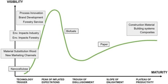 In applying the concept of hype cycle curves to the observations made in our study (Figure 6), the positioning of the different innovations remains generally vague with a few potential patterns. Hence, the purpose of this illustration (Figure 6) is to highlight differences between innovation expectations for these products arising from the data, but their placement on the curve is naturally not meant to be exact. Biofuels, for example, seem to have passed the peak of inflated expectations, reaching the trough of disillusionment. Building systems, construction materials, and composites may be considered on the slope to enlightenment towards the plateau of productivity. This may also apply to paper-based innovations, although on a much lower level. It seems that this category was likely assessed from the conventional pulp, paper, and paperboard products point of view. In contrast, the whole concept of nanocellulose was probably too far away from market application to allow for a proper consideration by the respondents without earlier exposure to forest sector innovation agendas. Hence, in the hype cycle model, nanocellulose may be placed at the very front end, and actually be placed even before the technology trigger.