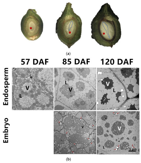Change of seed morphology and cell ultrastructure. (a) Photographs show longitudinal sections of fruits at 57, 85, and 120 days after flowering (DAF). Blue dashed dots outline the embryo, and red pentagrams indicate the endosperm; (b) Ultrastructure of endosperm and embryo at 57, 85, and 120 DAF visualized by transmission electron microscopy (TEM). Starch granules were indicated by red arrows. L, lipid body; V, vacuole.