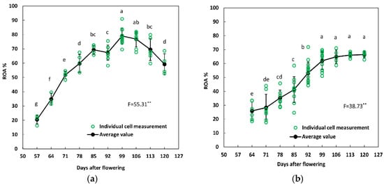 Relative oil body area (ROA) dynamics in benzoin endosperm (a) and embryo (b) cells. ** indicates significance at p < 0.01. Different letters within days after flowering (DAF) indicate significant ROA difference for endosperm or embryo cells (p < 0.05).