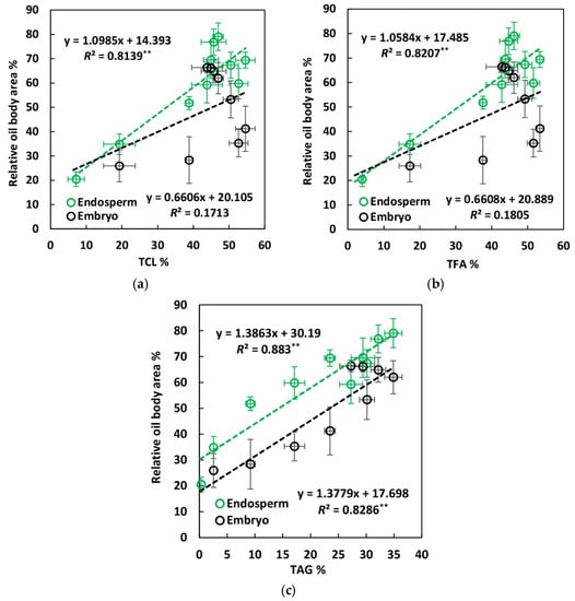 Significant linear relations were observed between the ROA in endosperm cells and all three kernel lipid variables (Figure 4). However, for embryo cells, ROA was only significantly linearly correlated with the TAG; moreover, our data in Figure 4 shows that a more closed relationship was found between ROA and TFA (rather than TCL), and the highest correlation of ROA was observed with TAG.