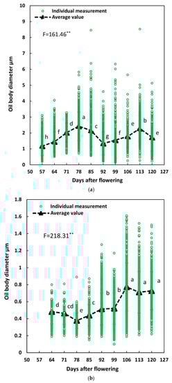 Dynamics of oil body diameter (OBD) in benzoin endosperm (a) and embryo (b) cells. ** indicates significance at p < 0.01. Different letters within days after flowering (DAF) indicate significant OBD difference for endosperm or embryo cells (p < 0.05).