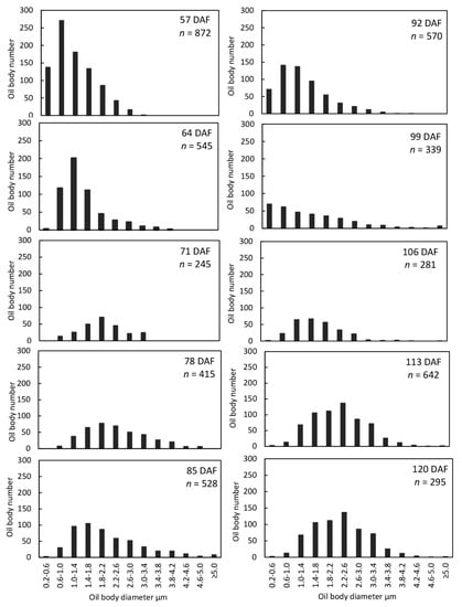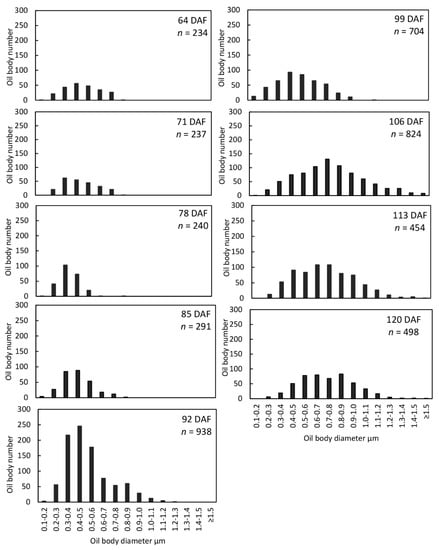 Profound OBD changes during S. tonkinensis seed development are demonstrated in Figure 6. Endosperm OBD saw its first peak at 78 DAF (Figure 6a). It then dropped over the next 14 days; thereafter, it rose linearly and peaked again at 113 DAF, with a 70.1% increase. The diameter distribution of endosperm oil body was investigated and shown in Figure 7. Average oil body in the embryo shrank from 64 to 78 DAF (Figure 6b); OBD then increased slowly before a remarkable 48.1% rise from 99 to 106 DAF, after which it reached a plateau (0.71–0.77 μm). The embryo OB numbers of different sizes are further illustrated in Figure 8.