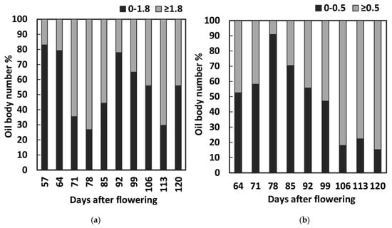 In general, the big oil body (BOB) (≥1.8 μm) fraction in endosperm cells increased from 57 to 78 DAF (Figure 9a). It then showed a fall-and-rise tendency and reached its second peak at 113 DAF. The endosperm small oil body (SOB) (0–1.8 μm) composition dynamics showed a pattern opposite that of BOB. The young embryo cells contained approximately equal amounts of SOB (0–0.5 μm) and BOB (≥0.5 μm) at 50 DAF (Figure 9b). The oil body composition changed rapidly afterwards. Overall, the SOB fraction peaked at 78 DAF and dropped in the next 42 days, with a large 83.2% decrease. Meanwhile, the BOB proportion generally had a 1.8-fold increase through the embryo cell development stages.