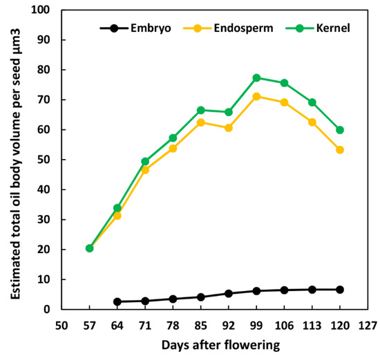 In this study, ROA was introduced to evaluate the oil deposition process. Our quantitative ultrastructural determination results indicated that the endosperm and embryo cells exhibited two different ways to accumulate lipids in benzoin (Figure 3). However, the decrease in oil accumulation rate was only observed in endosperms, with a nearly 25% decrease in ROA observed between 99 and 120 DAF (Figure 3a). Therefore, we ask how we could assess the ROA in endosperm and embryo cells as a whole. Unlike argan seed, in which two main tissues (embryo and endosperm) contribute equally to kernel volume [25], the embryo only occupies up to 10% of the volume in benzoin kernel (data not shown). We thus made a rough estimate of the whole-kernel oil body volume (Figure 10) based on the volume ratio between the endosperm and embryo. The kernel ROA dynamic turned out to be closely correlated to endosperm cells, which again suggested a reduced oil accumulation rate during benzoin seed development. Notably, cotyledon cells, which are the main storage tissues and the main location of TAG accumulation on the whole-embryo level [19], were selected to calculate the embryo ROA in the present study; the actual embryo ROA value, therefore, could be lower than the determined value.