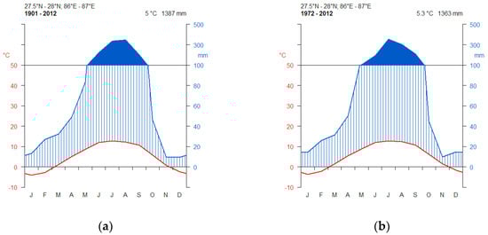 Climate charts of used CRU data. See Figure 1 for the location of the grid cells. The entire period of CRU data availability (a) shows higher amounts of precipitation in November and June and lower annual mean temperatures compared to last decades (b). Diagrams were produced with R package climatol [79].