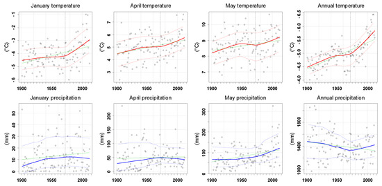 Monthly (January, April, and May; see Figure A1 and Figure A2 for all months) and annual CRU TS 4.0 mean temperature and precipitation sums: non-parametric trends 1901–2012 of the study area. The solid and dashed red lines show locally weighted scatterplot smoothing (LOESS) and corresponding spread smooths, respectively. For comparison, the green line illustrates a linear regression. The dashed black line indicates 1972, i.e., the first year of the period that was analyzed by static tree growth–climate correlations.