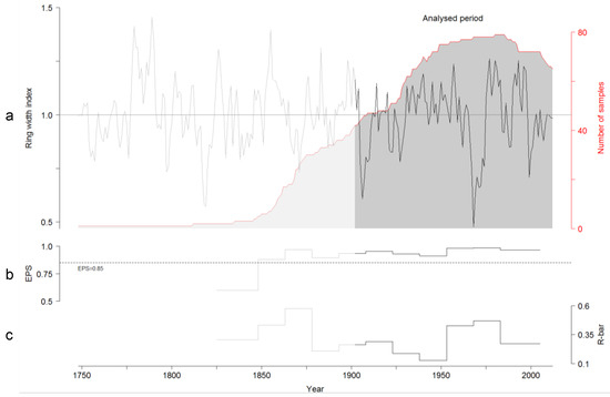 Tree-ring width standard chronology (black curve) and sample depth (red curve) (a); and corresponding EPS (b) and R-bar values (c). The lighter sections of the graphs show the part of the chronology that was not used for tree growth–climate analyses.