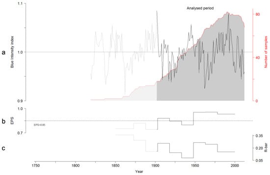 Blue Intensity standard chronology (black curve) and sample depth (red curve) (a); and corresponding EPS (b) and R-bar values (c). The lighter sections of the graphs show the part of the chronology that was not used for BI–climate analyses.