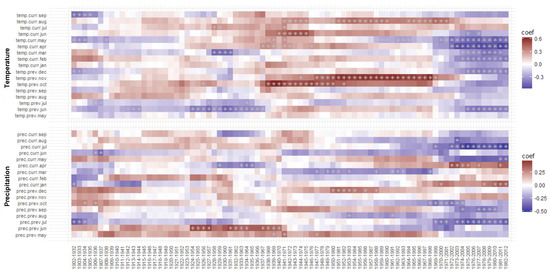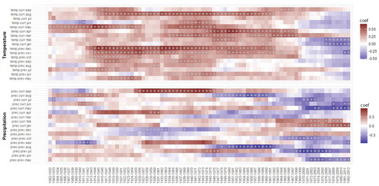 Blue Intensity chronology–mean temperatures and blue Intensity chronology–precipitation sums moving window correlations. Periods with asterisk indicate significant (p < 0.05) correlations.
