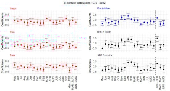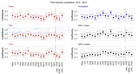 We calculated static correlations of TRW and BI with mean, mean minimum and mean maximum temperatures, precipitation sums, and SPEI for single months and seasons. To examine the stability of correlations for the analyzed period, we calculated 31-year moving window correlations [103] with one year offset between consecutive windows of TRW and BI.