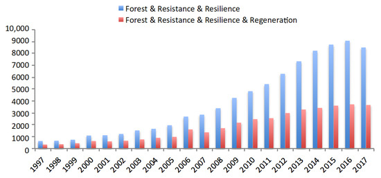 Number of publications by year since 1997 for the queries ‘forest AND resistance AND resilience’ and ‘forest AND resistance AND resilience AND regeneration’ using Scholar PlotR (https://csullender.com/scholar/) accessed on 23 February 2018.