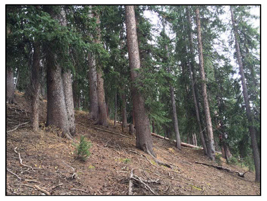 In many cases, building resilience to spruce beetle attack will depend on pre-disturbance regeneration. In some stands, this might be represented by advance reproduction established well ahead of the anticipated spruce beetle outbreak. For stands where advance reproduction is absent (e.g., Figure 2) or does not include the desired species (e.g., Engelmann spruce), building resilience requires timely management. It is at this stage where the silviculturist can effectively plan for the future by promoting advance reproduction of spruce or other, non-host, tree species. If increased tree species diversity is a future goal, selecting a diverse planting mix could also aid in reaching that future goal.
