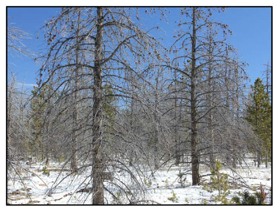 At the stand-level, metrics for structure and composition are not as well-established for mountain pine beetle (e.g., [29]). This may be due, in part, to the fact that mountain pine beetle has a number of host pine species in addition to lodgepole pine (e.g., ponderosa pine (P. ponderosa Lawson & C. Lawson), limber pine (P. flexilis James), whitebark pine (P. albicaulis Engelm.), sugar pine (P. lambertiana Douglas), and western white pine (P. monticola Douglas ex D. Don). However, for lodgepole pine stands, there is general consensus that resistance is inversely related to the abundance of the host, host tree diameter, and total stand relative density (Table 3; [30,31]).