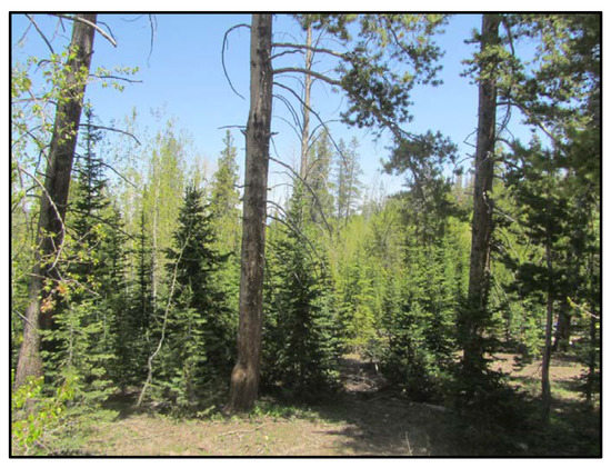 Approximately 25 years post-treatment, the structure and composition of the stand reflects considerable resilience to a mountain pine beetle outbreak (Figure 4). If an outbreak were to occur, high beetle numbers entering the stand from outside would almost certainly successfully attack the large lodgepole pine reserve trees. Because of pre-outbreak intervention, however, this stand has young, currently non-susceptible lodgepole pine and an abundance of non-host trees, including aspen, subalpine fir, and Engelmann spruce. The lodgepole pine saplings will eventually become susceptible to mountain pine beetle, but the considerable tree species diversity will continue to provide resilience if this structure and composition is consistent with broad management objectives. Depending on the management context, a particular characterization of resilience to a mountain pine beetle outbreak might be focused on a desired ecosystem process or function. For example, research in Colorado suggests considerable nitrate retention in mountain pine beetle-infested watersheds can result from residual vegetation components unaffected by beetles [43].