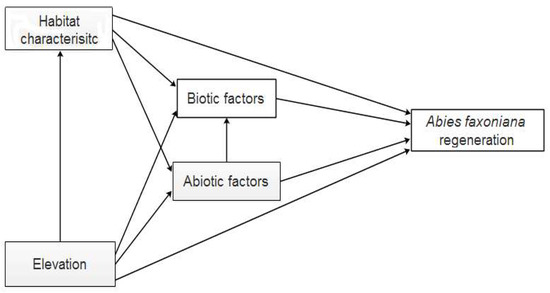 Our findings revealed the relationships among habitat characteristics, biotic factors, abiotic factors, and Abies faxoniana regeneration in forest gaps along the elevation. First, according to the initial results almost all of the biotic factors exerted a direct and positive effect on Abies faxoniana regeneration in our study. Second, compared with the biotic factors, the effect of abiotic factors on Abies faxoniana regeneration showed a complex ecological process that involved more additional factors and indirect effects. Third, the SEM explicitly predicted attributes by providing circumstantial direct/indirect effects analysis.