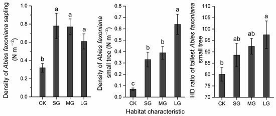 Data of Abies faxoniana regeneration (density of Abies faxoniana saplings, density of Abies faxoniana small trees, and the HD ratio of the tallest Abies faxoniana small trees) in different habitats (forest and different gap size) for the study area in a subalpine coniferous forest. LG, MG, and SG represent a large gap, medium gap, and small gap, respectively. CK represents non-gap plots. Different letters denote significant difference between treatments (Bonferroni-adjusted p-values < 0.01) by Duncan test.