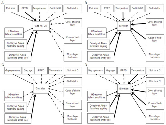 MANOVA analyses results showing endogenous variables difference estimates. Solid lines indicate the endogenous variables were significantly affected by the exogenous variables, and dash lines indicate the non-significant relationship between the endogenous variables and exogenous variables (p ≥ 0.05). Solid line width is weighted by the magnitude of significant coefficients (thick lines represent p < 0.001, and fine lines represent p < 0.05). (A,B) Data include forest gap (N = 26) and CK (N = 8). (C,D) Data only show the difference in forest gaps (N = 26).