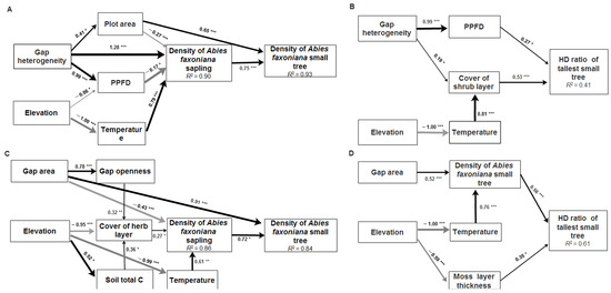Best structural equation models for predicting Abies faxoniana regeneration. Four models are presented, (A) how gap heterogeneity and elevation shaped density of Abies faxoniana saplings and density of Abies faxoniana small trees; (B) how gap heterogeneity and elevation shaped the HD ratio of the tallest Abies faxoniana small trees; (C) how gap area and elevation shaped density of Abies faxoniana saplings and density of Abies faxoniana small trees; (D) how gap area and elevation shaped the HD ratio of the tallest Abies faxoniana small trees. The variables of Abies faxoniana regeneration in boxes are their variances explained by the model. All path coefficients represent standardized partial regression coefficients. Error variables are not shown in this figure. The exogenous variable of gap heterogeneity is coded as forest gap = 1 and forest = 0. The endogenous variables, as predicted variables, are the plot area (the area of gap and CK) (m2), gap area (m2), gap openness, cover of shrub layer (%), cover of herb layer (%), moss layer thickness (cm), PPFD (μmol m−2 s−1), temperature (°C), soli total C (%), density of Abies faxoniana saplings (N m−2), density of Abies faxoniana small trees (N m−2), and the HD ratio of tallest Abies faxoniana small trees. The shaded arrows represent the negative effect and the black arrows represented the positive effect. The thickness of the arrows indicates the magnitude of correlation between variables and significant coefficients are indicated by asterisk (* p < 0.05, ** p < 0.01, *** p < 0.001).
