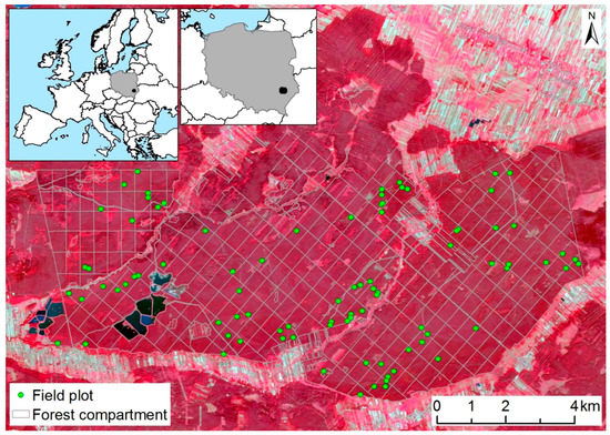 The study area is located in the South-Eastern Poland. The analyzed area of about 7800 ha of managed forest stands is owned by the Polish State Forest National Holding (Figure 1). The Scots pine (Pinus sylvestris L.) is the dominant tree species with a 95% share of the total stock. According to the forest inventory data provided by the Polish State Forest National Holding the average stand age is 67 years. The stands are generally even-aged and one layered.