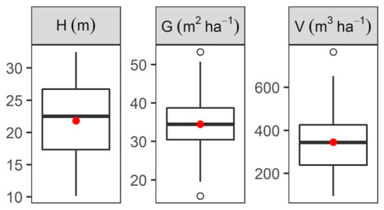 Obtained measurements of H, G and V at plot level (minimum, first quartile, median, third quartile, and maximum; mean value is marked as the red point).