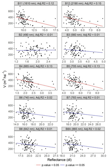 Relationships between growing stock volume (V) at plot level and Sentinel-2 surface reflectance dimensionless (dl) values used as predictor variables (band center wavelength in nm is given in brackets). Adj.R2 is the Adjusted R-squared.