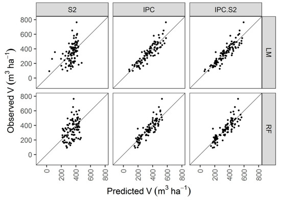 The 6 growing stock volume (V) predictive models were created based on predictor variables obtained from spectral bands of Sentinel-2 images and IPC metrics, using two regression methods (LM and RF). The relationships between observed and predicted values of V obtained from bootstrap resampling are presented in Figure 4.