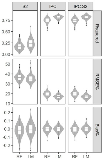Averaged R2, RMSE, RMSE%, Bias and Bias% values for the created predictive models are presented in Table 7. Additionally, the distribution of the selected performance metrics (R2, RMSE%, Bias%) from the 500 bootstrap runs are presented in Figure 5. The best model was achieved using LM based on the IPC combined with the Sentinel-2 image, with RMSE%IPC.S2.LM = 16.95% and R2IPC.S2.LM = 0.82. The LM regression method created more accurate models than the RF method in all predictor variable sets. The bias was close to 0 for all constructed models. The poorest model was obtained with the RF method based on S2 data, with RMSE%S2.RF = 36.46% and R2S2.RF = 0.17. The largest difference in R2 was observed between the IPC.S2.LM and the S2.RF models (0.65). The difference in RMSE was also highest for this pair of analyzed models. Inferential assessment of model performance showed that the differences in accuracy in terms of R2 and RMSE were statistically significant (α = 0.05) for all pairs of models excepting the IPC.S2.RF and IPC.RF pair. The results of the inferential assessment of the models’ differences in terms of R2 are presented in Table 8.